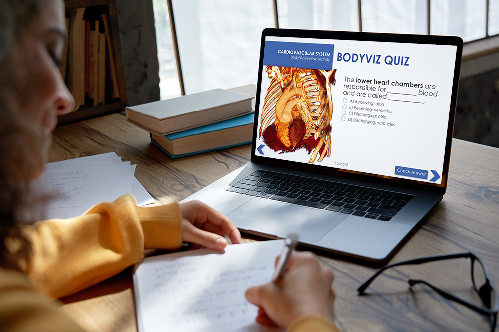 Students no longer need to rely solely on lab schedules. BodyViz creates a virtual anatomy lab experience that your students can take with them wherever they go. They can log in from their own computers, repeat dissections, and review materials as often as needed. This flexibility supports different learning styles and paces. Our suite of active learning modules contains structured virtual dissection activities and quizzes that students can complete online via our BodyViz Portal.